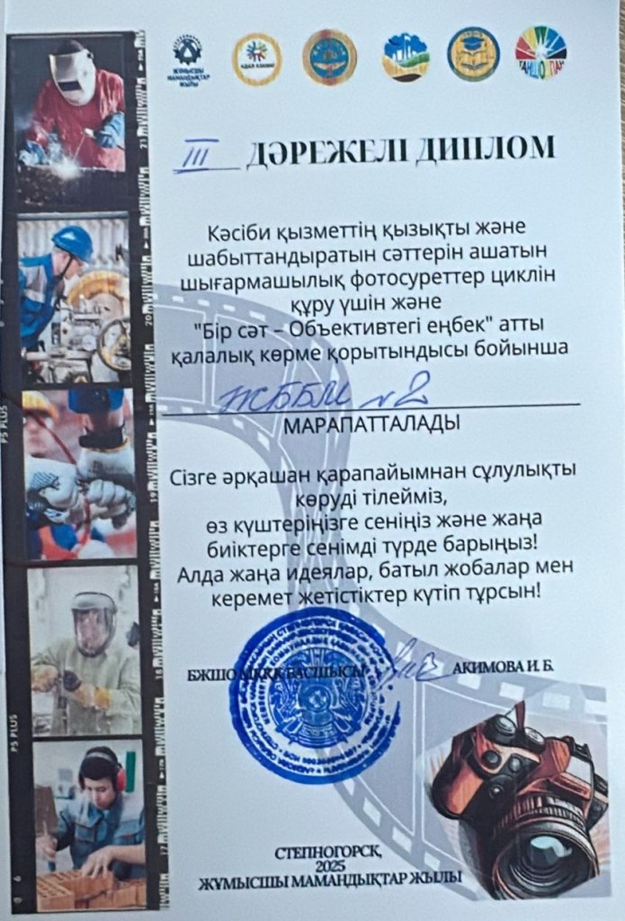 Құттықтаймыз! "Мектеп Паламентінің" мүшелері "Бір сәт - Объективтегі еңбек" атты қалалық көрмеге қатысы ІІІ дәрежелі дипломмен марапатталды. Топ жетекшісі: Кәкім А.А.