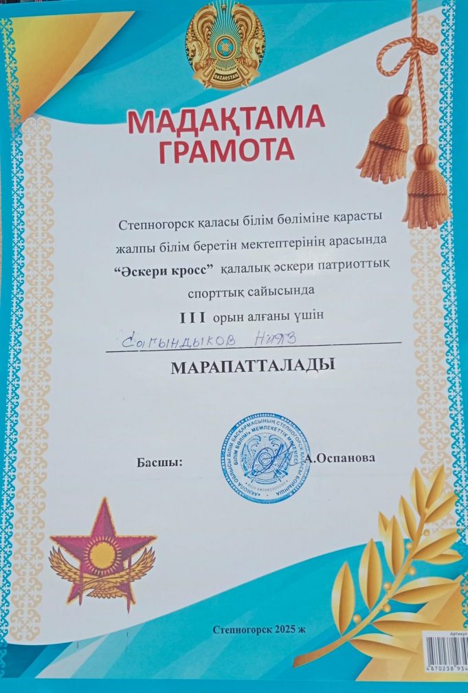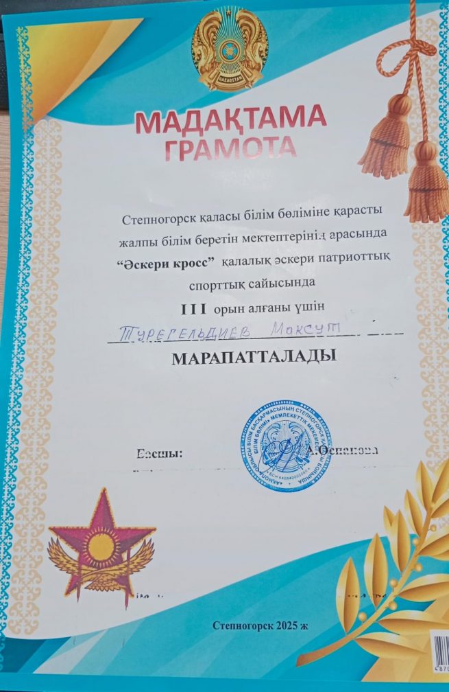 Мектебіміздің оқушылары Сагындыков Нияз және Турегельдиев Максут "Әскери кросс" қалалық әскери патриоттық спорттық сайысында ІІІ орынға ие болды! Құттықтаймыз!